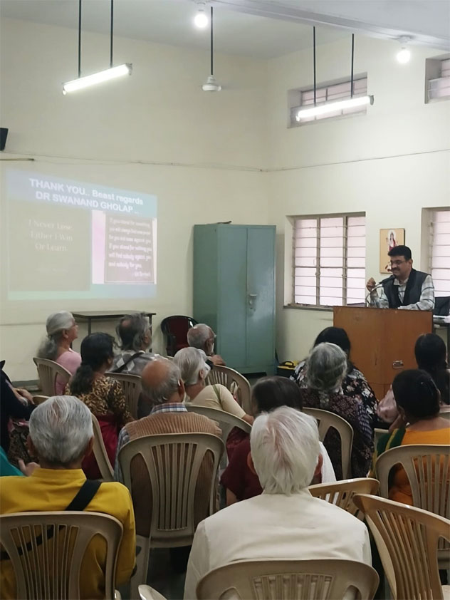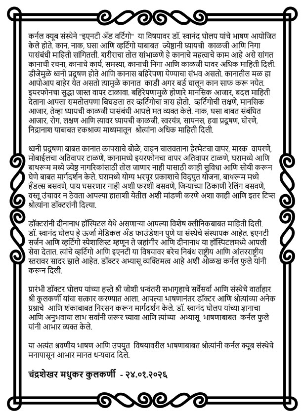 कर्नल क्यूब संस्थेने शनिवार, २४ जानेवारी २०२६ रोजी "इएनटी अँड वर्टिगो" या विषयावर डॉ. स्वानंद घोलप यांचे भाषण आयोजित केले होते. कान, नाक, घसा आणि व्हर्टिगो याबाबत ज्येष्ठानी घ्यायची काळजी आणि निगा यासंबंधी माहिती सांगितली.